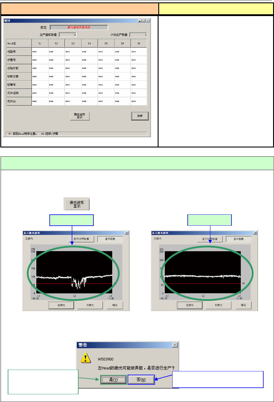 操作手册Ⅰ 3-4 3-4 激光脏污 如果选中操作选项“生 产 ( 功能 2) ”标签 中的 “进行激光传感器脏污检查” , 则搬 入基板时会进行激光脏污检查, 检测出激 光脏污时会暂停。 ①激光视窗有脏污。 ②激光视窗有伤痕。 处理错误的方法 1) 遇到「激光脏污错误」时,贴片头将移动到前面后暂停。 2) 请参照『操作手册Ⅱ』「 5-3-4 激光校准传感器」,清扫激光视窗。 3) 清掃后请按下 ,在「激光波形显示」画面上确认是否去除了…