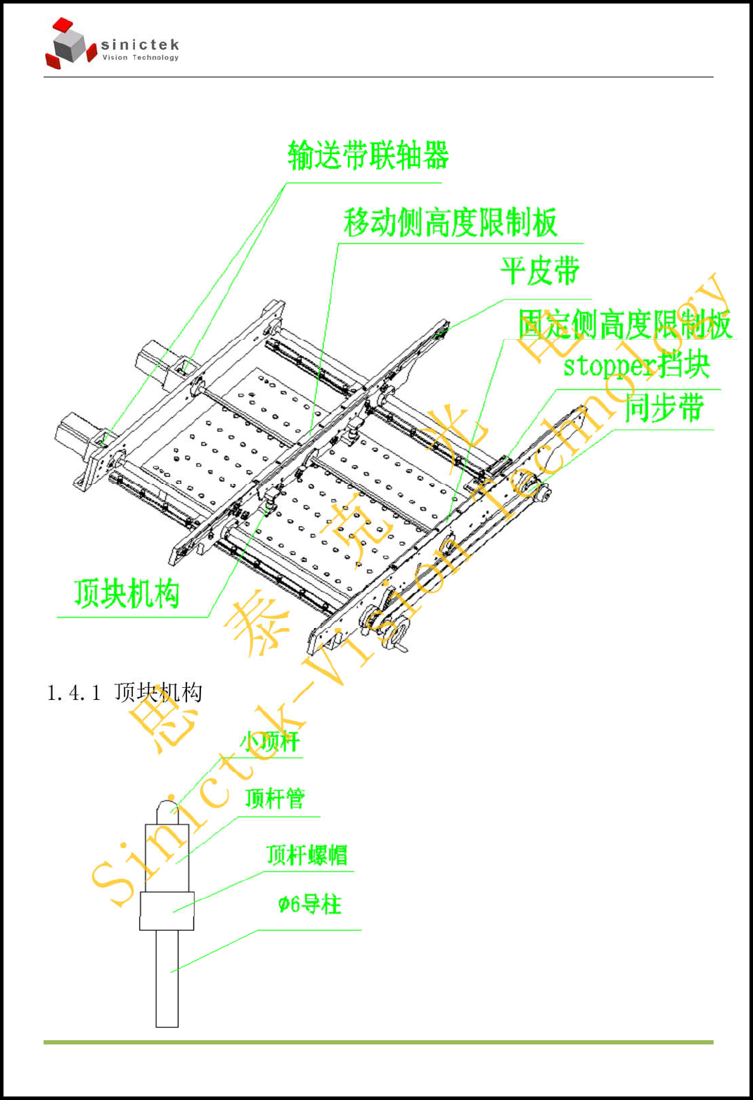 3DSPI 结构、电气手册 思泰克光电科技有限公司 P age 6 Copyright by Sinic-T ek V ision T echnol ogy Co., L td. 1.4输送带结构 1.4.1顶块机构