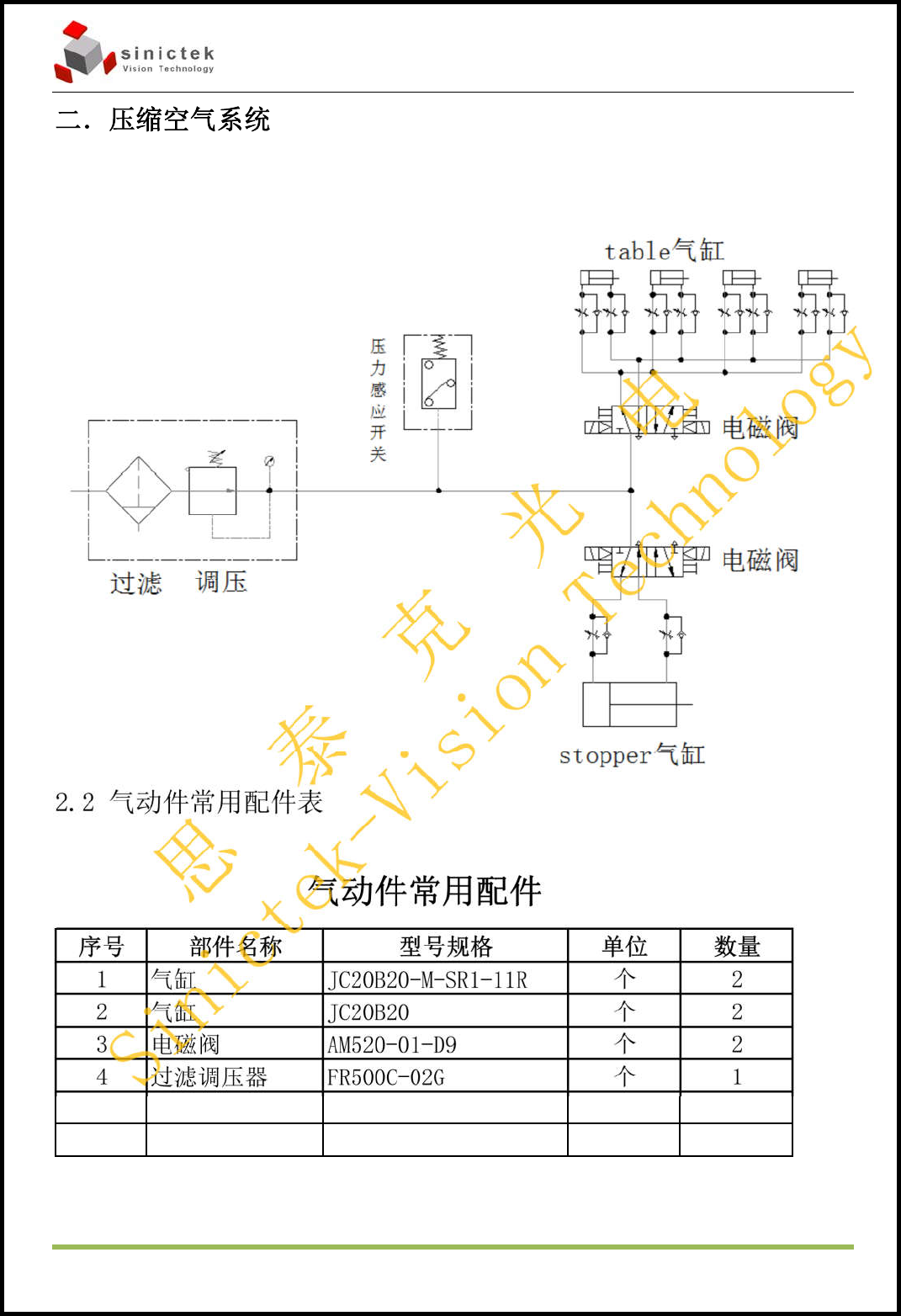 3DSPI 结构、电气手册 思泰克光电科技有限公司 P age 8 Copyright by Sinic-T ek V ision T echnol ogy Co., L td. 2.1压缩空气气路图 2.2气动件常用配件表 1 气缸 JC20B20 -M-SR1-11R 个 2 2 气缸 JC20B20 个 2 3 电磁阀 AM520-0 1-D9 个 2 4 过滤调压器 FR500C- 02G 个 1 5 节流…
