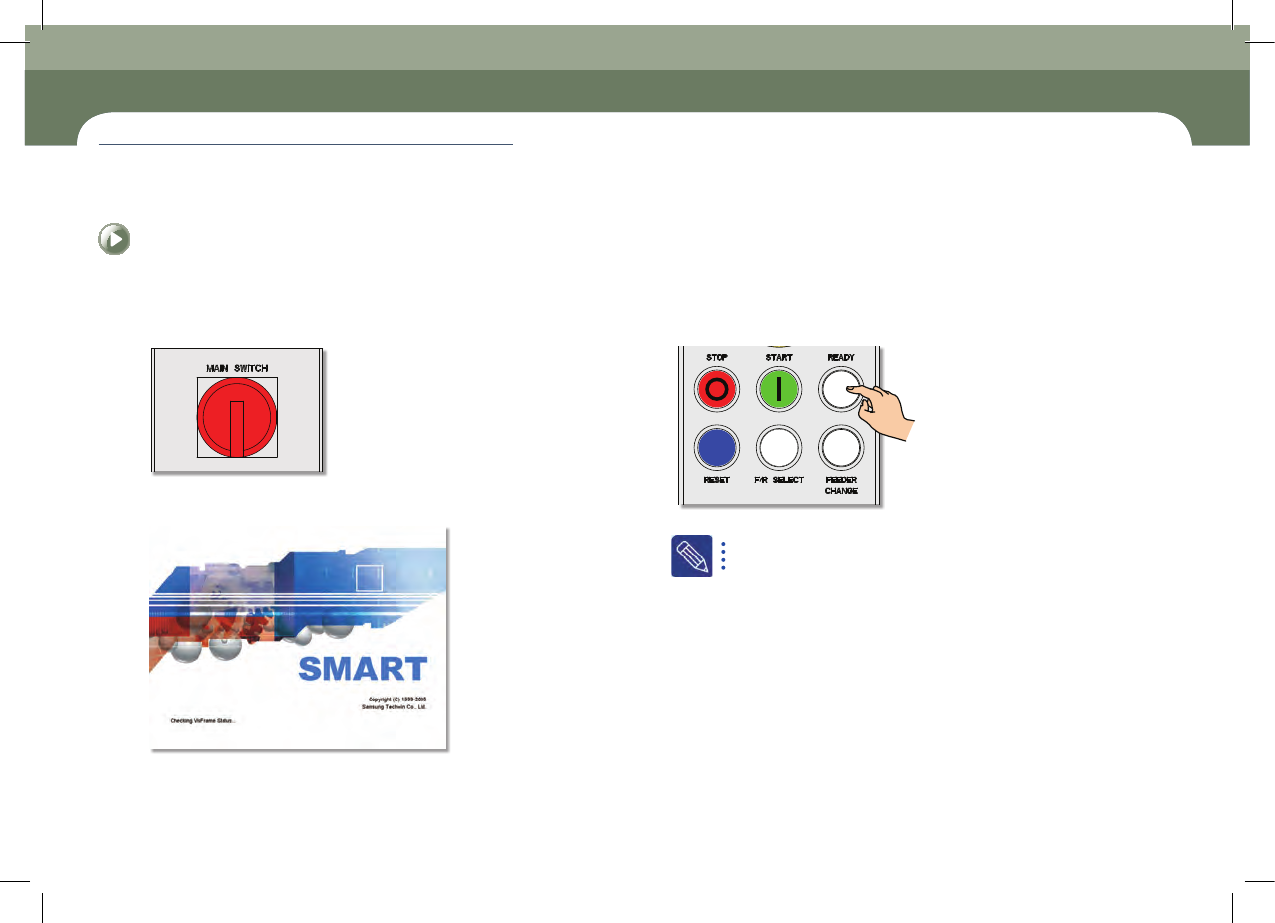Chap ter 2 本 Chapter 主要介绍电源供应方法及生产开始前的检验事项。 电源供应及暖机 Fas t Fl ex ib le P la cer Operation Handbook 2-3 生产前 准备 程序 > MMI初始 化 生产前准备程序 3. MMI 初始化 Step 1. Main 开关 On Step 2. MMI 初 始化及 模块检 验 ( 自 动 ) Step 3. 按 ' R E A DY…