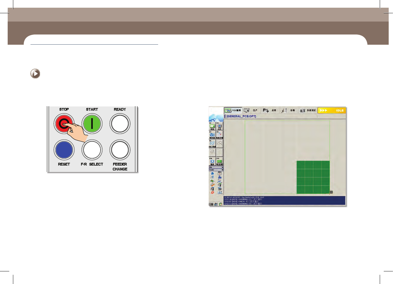 生产过程中的检验事项 Chap ter 4 Operation Handbook 4-1 6 本 Chapter 主要介绍检验生产中错误或其他事项并采取措施时的设备暂停方法(继续/开始 模式) , 异常停止方法( 人为/系统异常停止) , 异常停止后系统重启方法等 紧急 停 止 > 系统 异常 停 止: 系统 自 我判断 异 常 停 止时措施方法 紧急停止 生产过程中的检验事项 Step 3. 按 'RESE T&apo…