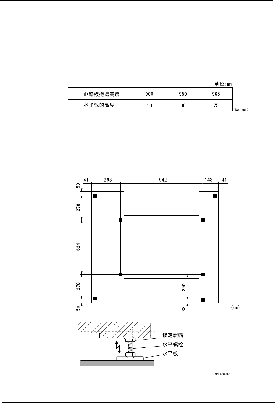MEC-XP143-3.0S 9. 安装 XP-143E 机械手册 131 9. 安装 9.1 安置 9.1.1 要点 把水平板放在指定的位置,以确 保主机的水平。 此外,需要根据电路板的搬运高 度,选用适合的水平板。 9.1.2 方法 1. 参考下图布置水平板。 2. 把 2 个水平仪装在主机的机座上。 ( 横向和纵向 ) 3. 转动各个水平螺栓调整高度。 4. 确认电路板的搬运高度、机器的水 平度是否正确之后,请把各个锁定 螺帽拧紧…