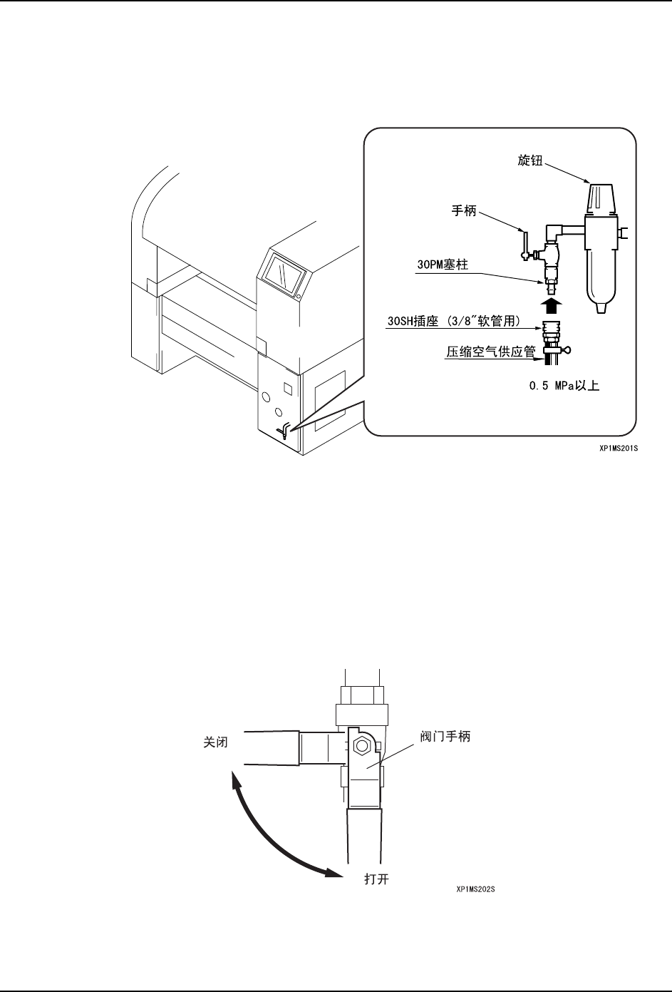 把外部压缩空气供应管接到主机上,并用调节器调整到规定的空气压力 (0.5 M Pa)。