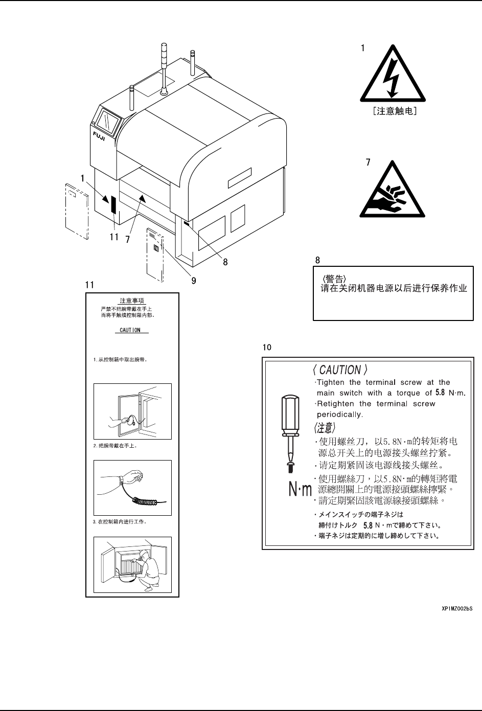 MEC-XP143-3.0S 1. 安全指南 XP-143 机械手册 7 1.4 安全标示 表示使用机器时的注意事项的标 示牌贴在本机器的如下图所示的位置 , 请仔细阅读, 确保安 全操作。 The machine may be damaged if attempting to remove feeders during operation. CAUTION