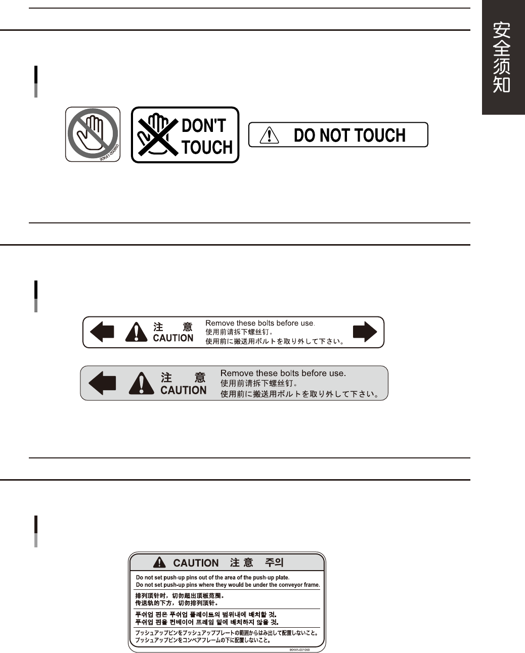 xviii ■注意内容 c 注意 用指定以外的溶剂,会造成机器受到损害或引起火灾。 ■ 对象机器 印刷机所有机型 严禁使用指定外的溶剂 91114-LC-00 ■注意内容 c 注意 开启或关闭有此标贴的外盖时,必须先抽出清洁装置。如不按顺序操作,可能导致外盖受损。 ■ 对象机器 YVP-Xg 注意外盖的开启和关闭 91115-LC-00 ■注意内容 c 注意 切勿猛烈撞击贴有此标贴的一面。会造成破损、功能丧失…