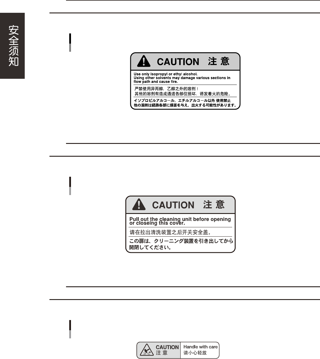 开启或关闭有此标贴的外盖时,必须先抽出清洁装置。如不按顺序操作,可能导致外盖受损。