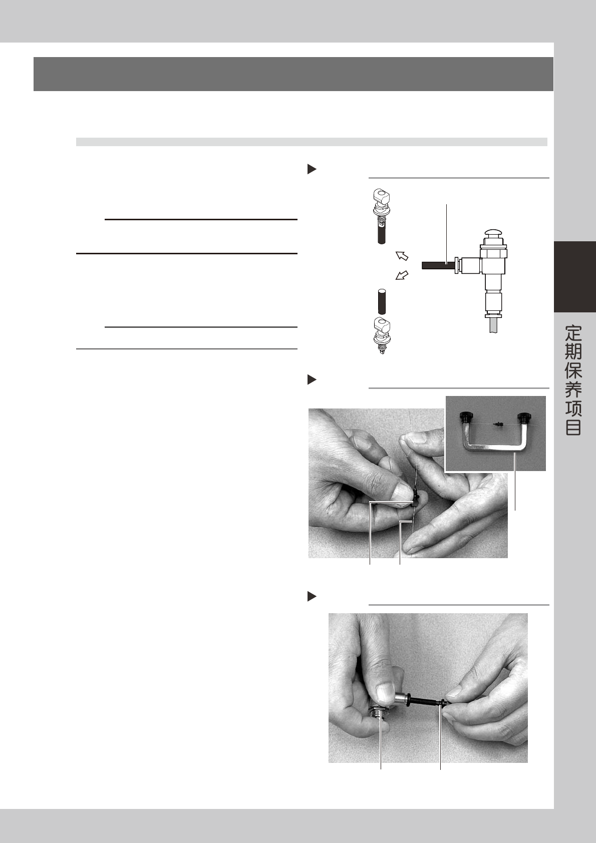 3-7 3  2. 每月或隔月 本节以点检后的清洁及加油为中心作详细介绍。 2.1 吸嘴空气通道的清洁 ( 每月 ) e 1 拆下吸嘴。 按下紧急停机按钮,取出吸嘴。为了安全作业,务 必使贴片机处于紧急停机状态。 c 注意 配备吸嘴交换站 ( 选配 ) 的贴片机,务必将取出的吸嘴放回 吸嘴交换站。 2 进行喷气排屑。 用喷气枪从吸嘴两端吹除吸嘴内部的尘屑。 55307-L2-00 n 要点 如脏污严重,需执行下述 Step3、4…