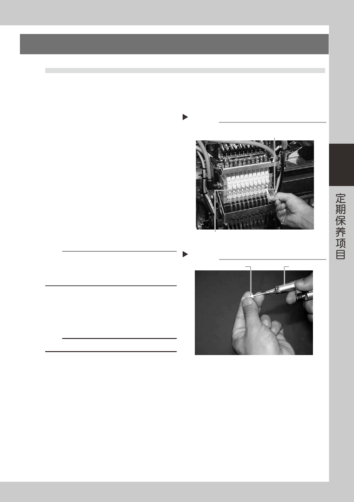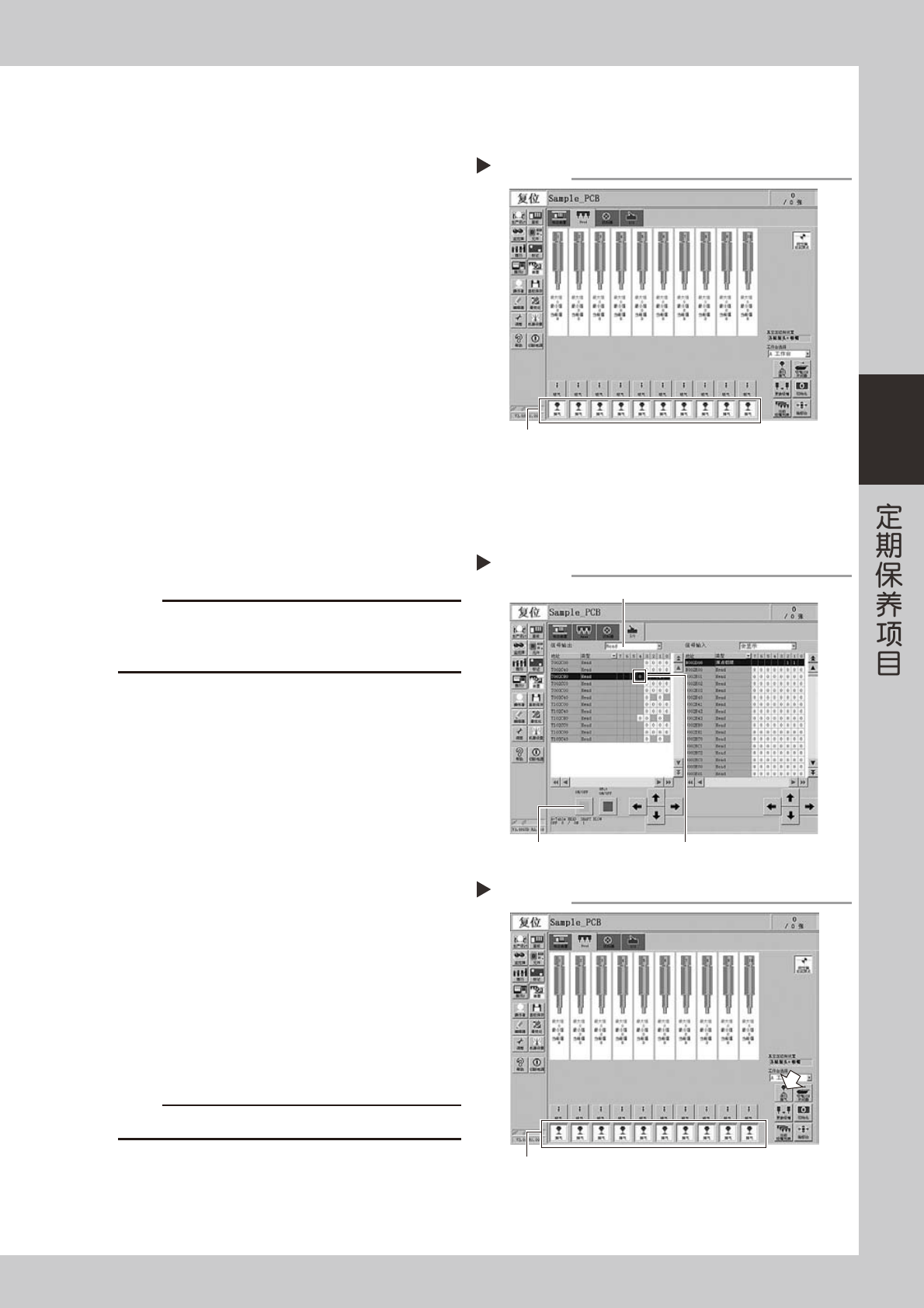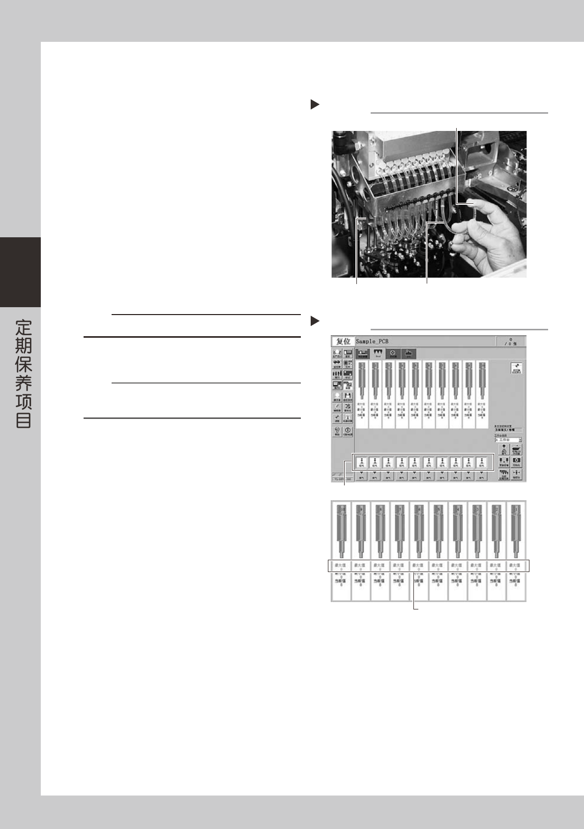 3-16 3 3.1.1 真空电磁阀的真空压检查 确认真空电磁阀装置的各个真空电磁阀的真空压级别,判断其状态。 e 1 按紧急停机按钮。 为安全作业,务必使贴片机处于紧急停机状态。 2 拔出输气管。 从轴承套下侧的气密接头处拔出所有贴装头的输气 管。 55323-L2-00 3 确认单个真空电磁阀的真空压级别。 1. 打开 [ 装置 ] -「Head」选项卡。 2. 用手指堵住输气管,按 [ 吸气 ] 按钮。对所有 贴装头分别执行此操…