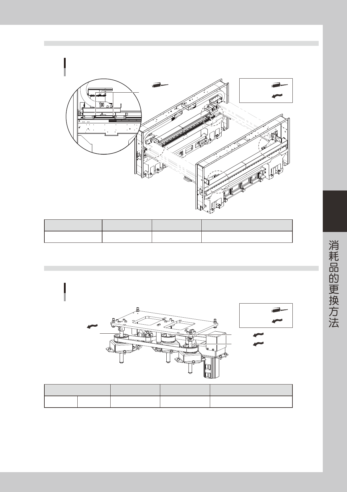 4-8 4 4. 加油位置一览表 以下,介绍各部加油位置、加油频率及操作方法。 ■ 使用润滑油 加油用的润滑油,务必使用 YAMAHA 指定的润滑油。 润滑油名称 : NSL 零部件编号 : K48-M3856-00X 4.1 X 轴线性导轨与螺旋丝杆 X轴线性导轨部 X轴线性导轨部 X轴的加油位置 线性导轨与螺旋丝杆 润滑油注油嘴(小) 2处 润滑油注油嘴(大) 2处 X轴螺旋丝杆部 润滑油注油嘴(大) 1处 润滑油枪 : 用…