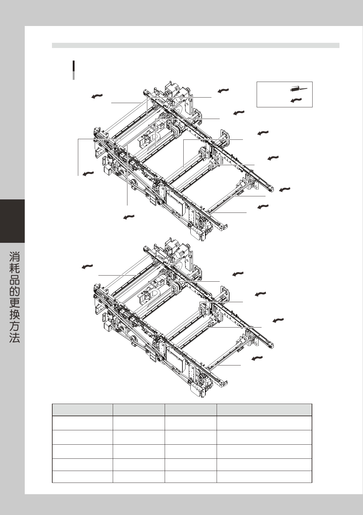 4-9 4 4.2 Y 轴线性导轨 Y轴的加油位置 Y轴线性导轨部 润滑油注油嘴 润滑油枪 : 用手涂抹 : 加油部位 加油位置 频率 作业方法 Y 轴线性导轨 4 1 次 / 2 个月 润滑油枪 : 标准喷嘴 55414-L2-00 4.3 PU 轴螺旋丝杆 PU轴的加油位置 螺旋丝杆 螺旋丝杆 螺旋丝杆 润滑油枪 : 用手涂抹 : 加油部位 加油位置 频率 作业方法 PU 轴 螺旋丝杆 3 ( 各工作台 ) 1 次 / 2 个月 用…