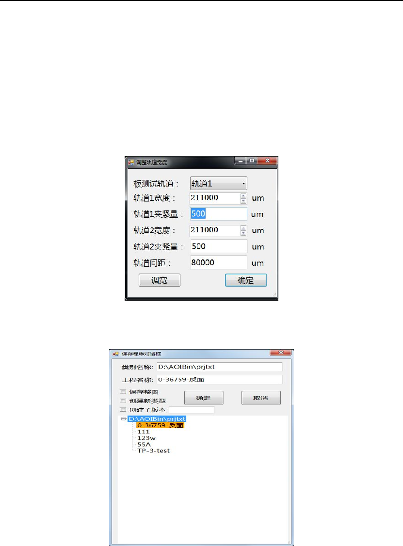 4)当勾选“调轨”选项时,会弹出调宽对话框对轨道宽度进行调节,“板测试轨道”指程序