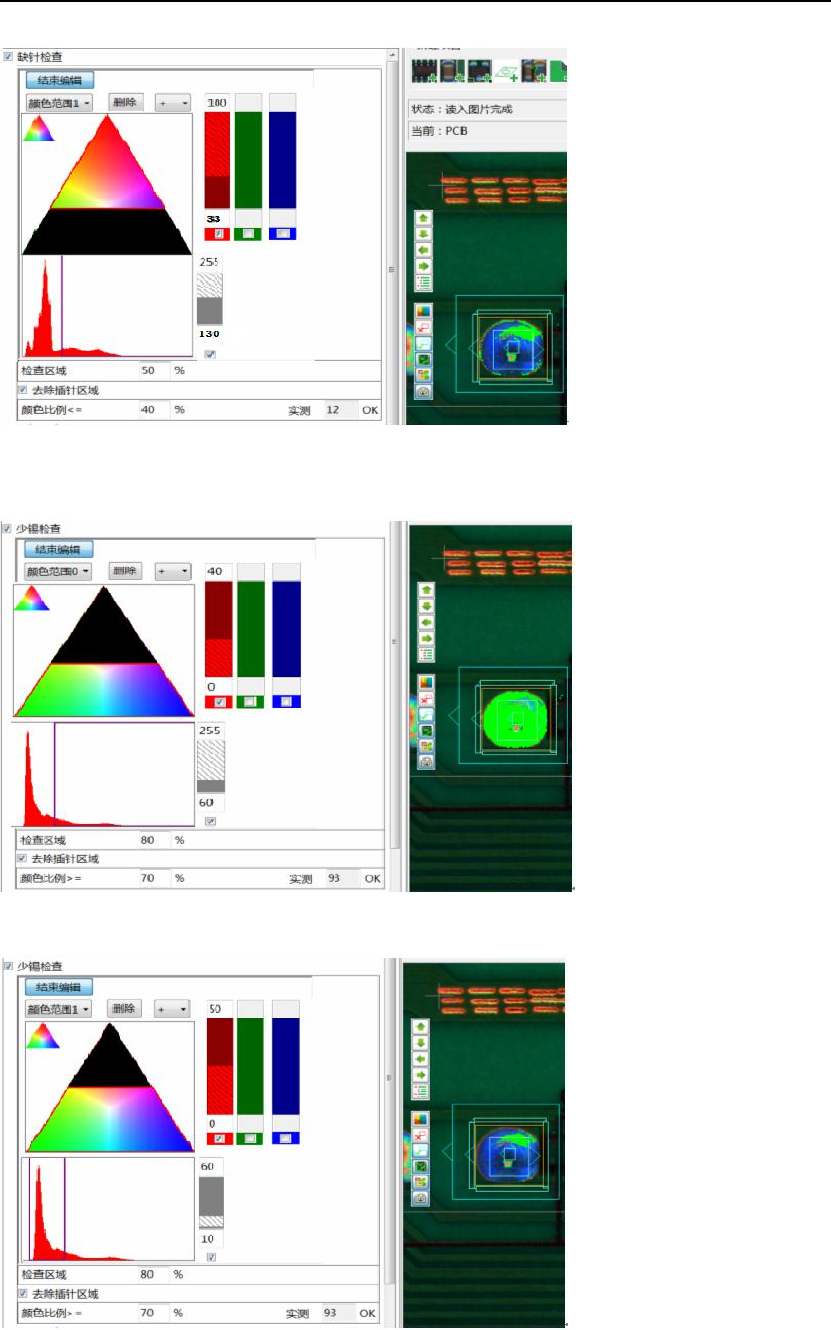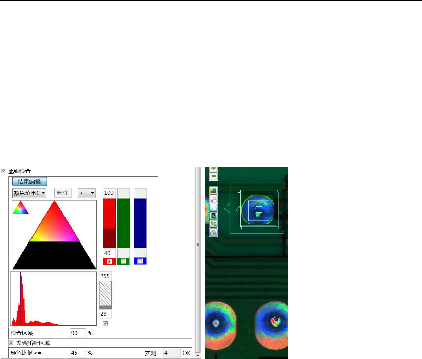 炉后 AOI 手册 109 3 )开焊检查 ① 中央颜色 与缺针检查颜色抽取相同( 2 组颜色) ②重心偏移 与缺针检查颜色抽取相同( 2 组颜色) ③逻辑组合 通常采用:1+2 4 )露铜检查 ( “颜色范围 0 ”抽取红色)