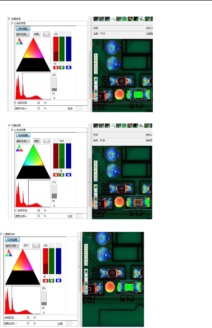 炉后 AOI 手册 11 8 B. “ 颜色范围 1”抽取较暗的非红色(即 暗蓝&绿色) 2)开焊检查颜色抽取 ①全体焊盘 A. “颜色范围 0” 抽取明亮的非 蓝色
