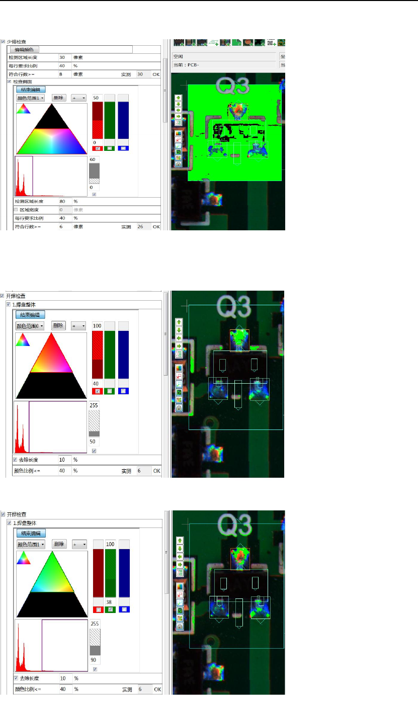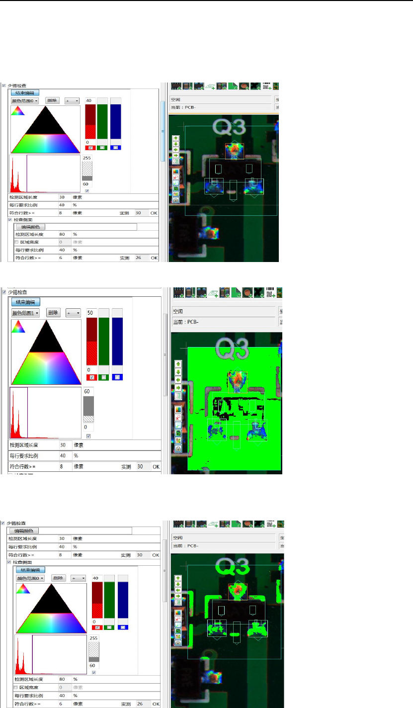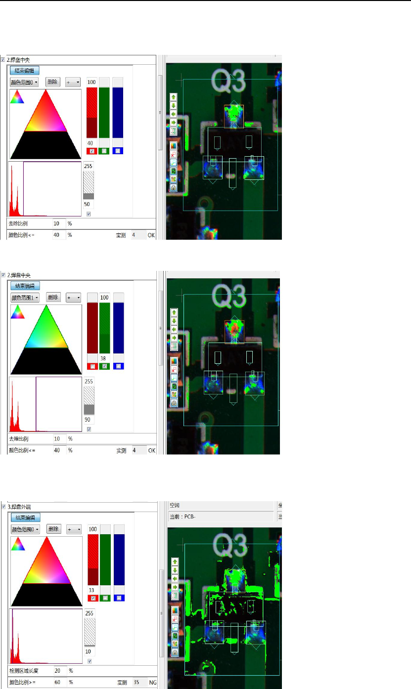 炉后 AOI 手册 127 B. “颜色范围 1 ”抽取 较暗的非红色(即 较暗的蓝、绿色) 2 )开焊颜色抽取实例 ① 焊盘整体 A . “颜色 范围 0 ”抽取 红色 B . “ 颜色范围 1 ”抽取绿色