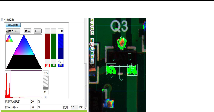 炉后 AOI 手册 133 3 .2. 3 I C 类元件 实例 自 动检 索窗 1 .常规参数设置指南 2. 常规颜色抽取实例 1 )引脚纵向位置检索 (本 例选取引脚内端检 索法, “颜色范围 0 ”抽取 引脚内端的颜色)