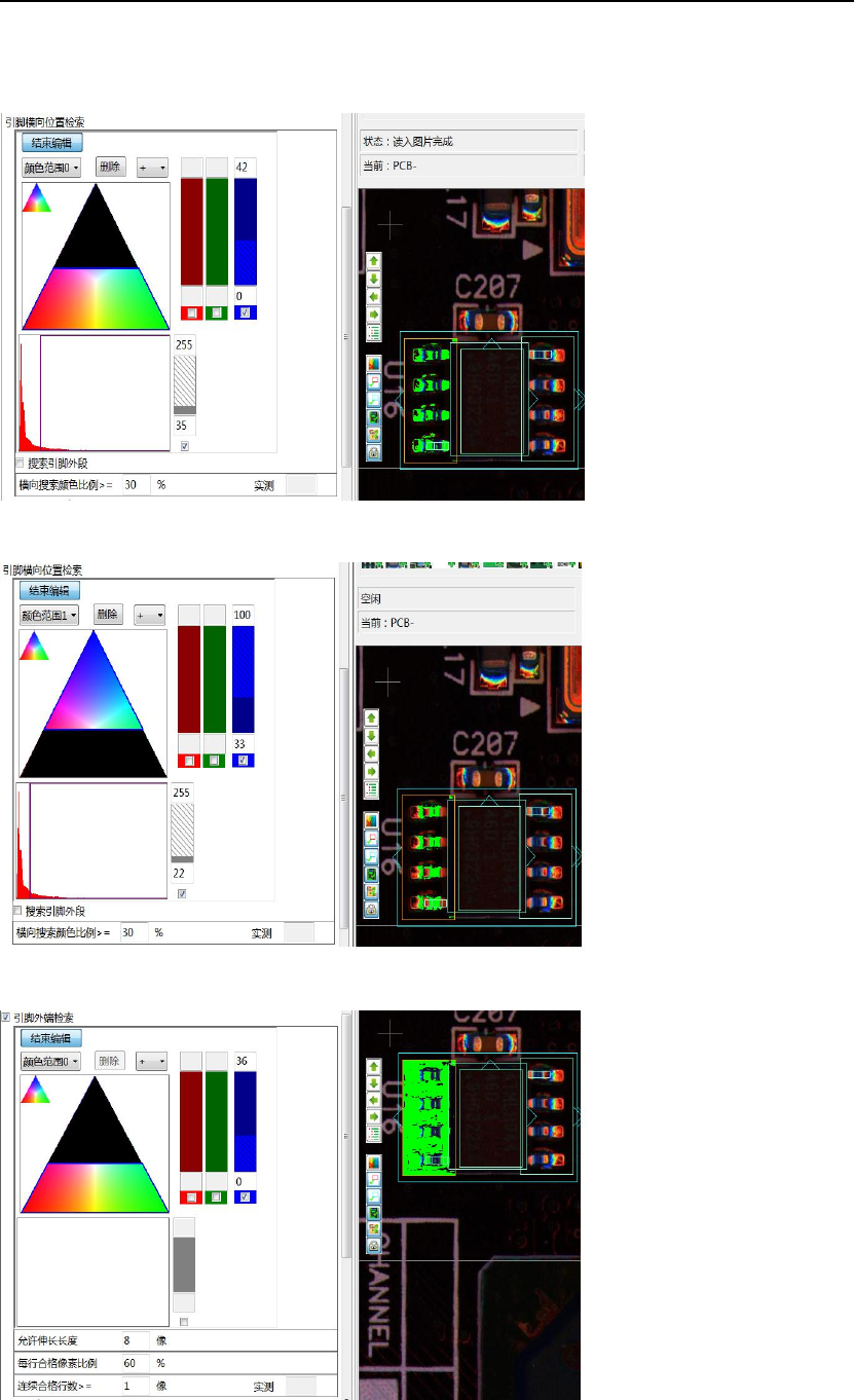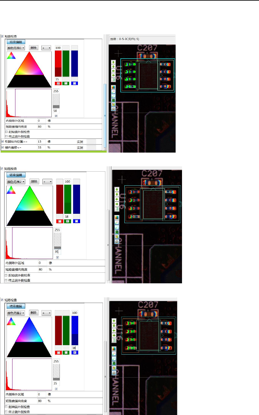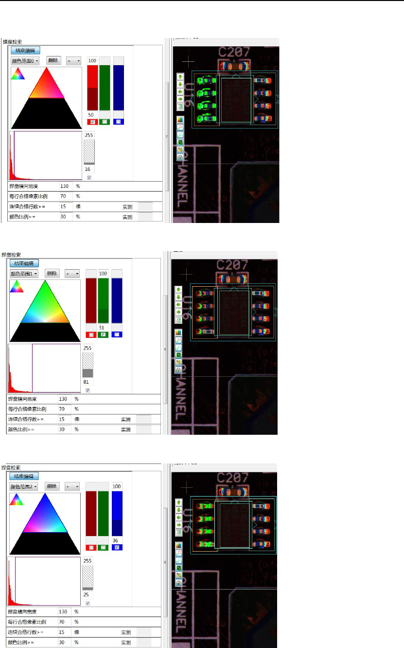 炉后 AOI 手册 135 A . “颜色范围 0 ”抽取焊盘的红 色部分 B . “颜色 范围 1 ”抽取 焊盘的绿色部分 C . “颜色 范围 2 ”抽取 焊盘的蓝色部分