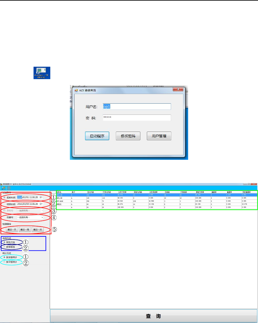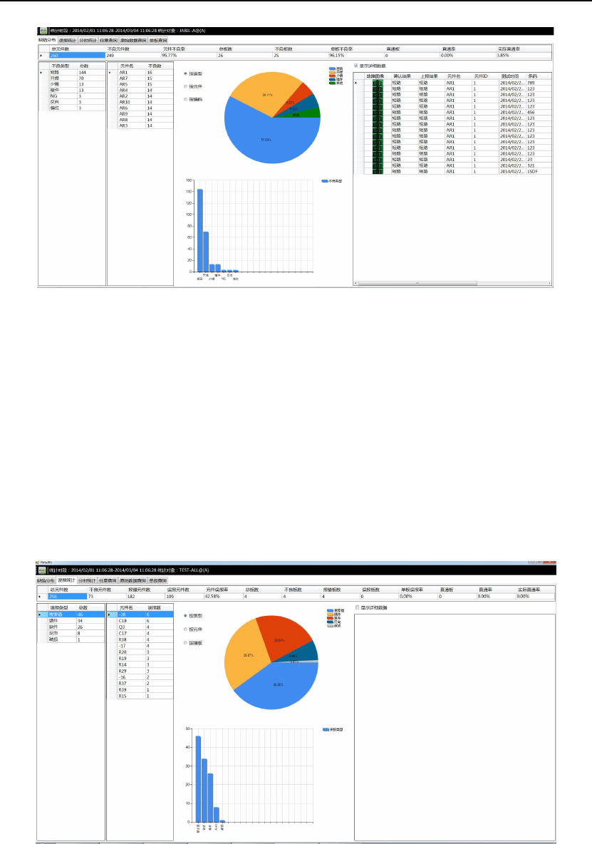 炉后 AOI 手册 158 5)当 选好过滤 条 件及 选 择方式后 会 在右 上 角出现待 统 计对 象 记录(如 上 图中 绿 框中的内 容 ) , 统计 内容包 含程序名 (基 种名 称) 、批次、 总元 件数 、不良元 件数 、元 件不良率 、误 报元 件数、元 件误 报率 、总 板数、 不良板 数、 单 板不良率 、 直 通板 、 直通率 ( 测 试) 、实际直通率;双击某 个机 种数据或 选中 某个 机种 后点击 界面下方 …