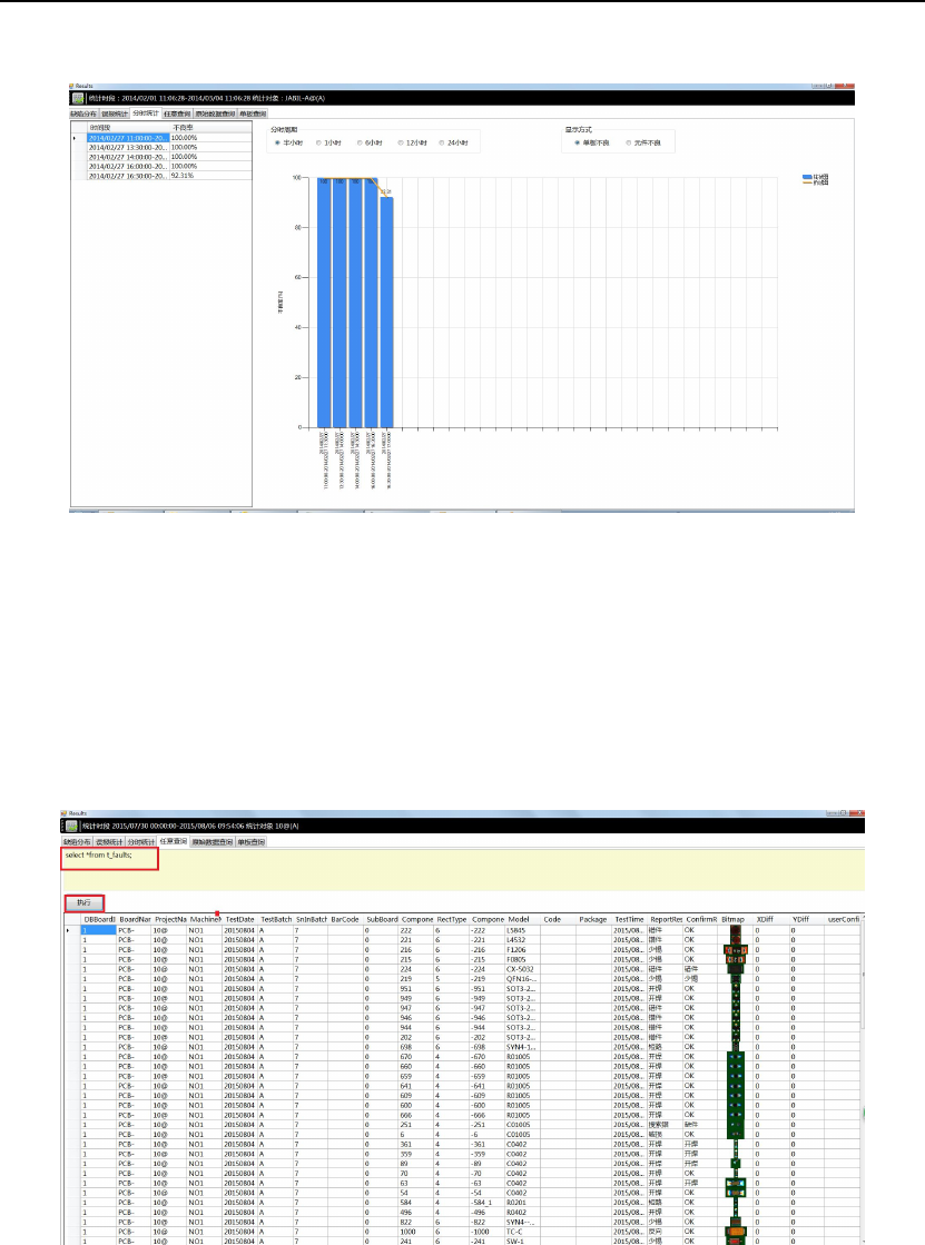 炉后 AOI 手册 160 分时统计 1) 选 择 “分 时 周期 ” ( 如 上图 中 红框 所 示内 容 ) , 可选按 “ 半 小 时” 、 “1 小 时” 、 “6 小 时” 、 “1 2 小时 ” 或 “24 小时” 为单 位进 行分时统 计; 2) 选 择“ 显 示方 式” (如上 图中 蓝 框所示 内容 ) , 可选 按“单 板不 良 ”或 “元件不 良 ”进 行统 计;当 选按 “单板不 良 率 ”时 ,显示 的柱 状图…