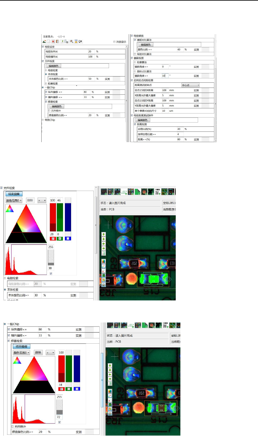炉后 AOI 手册 37 电极亮度差异 ≤___ % 说明: 1. 抽取电极的颜 色及亮度。 2. 如果计算出的 比例大于设定值, 则 OK ;否 则 NG ,报电极破损 错误。 □偏转 检测 ○轮廓算法 ○面积占比算法 偏转角度 ≤___ 说明: 选取相应的算法: 当本体检索采用 “电极检索” 或 “本体检索” 方式时, 偏转检测则应选 “面 积占比算法” ; 本体检 索采用 “轮廓检索” 方式时, 则此处应选择 “轮廓算 法” 。 …