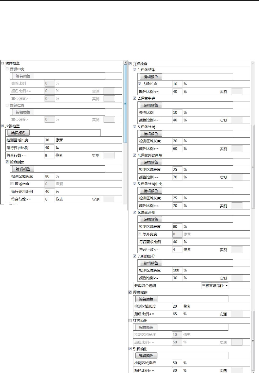 炉后 AOI 手册 71 说明: 1 .从引脚外端 开如往外 N 个像素,如上 图所示,作为检测区域。 2 .抽取红胶颜 色(一般为红色) 及亮度。 3 .在检测区域内 ,如果计算出的颜色 百分比小于设定值时 ,结果 O K ,大于 设定值时 NG , 报红胶溢出错 误。 □ 引脚偏出 检测区域宽度 ___% 颜色比例 ≤___% 说明: 1 .抽取引脚的 红色及亮度。 2 .以引脚 横长为 100% , 将设定的检测区 域的百分比作为…