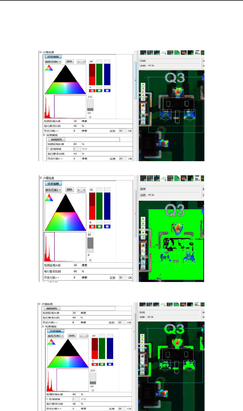 炉后 AOI 手册 73 2 .常规颜色抽取实例 1 )少锡(分为正面及侧面检查) ① 少锡 (正 面) A. “颜色 范围 0 ”抽取明亮的非 红色(即明亮的蓝 、绿色) B. “颜色范围 1 ”抽取 较暗的非红色(即 较暗的蓝、绿色) ② 侧面检查 (少 锡侧面) A. “颜色 范围 0 ”抽取明亮的非 红色(即明亮的蓝 、绿色)