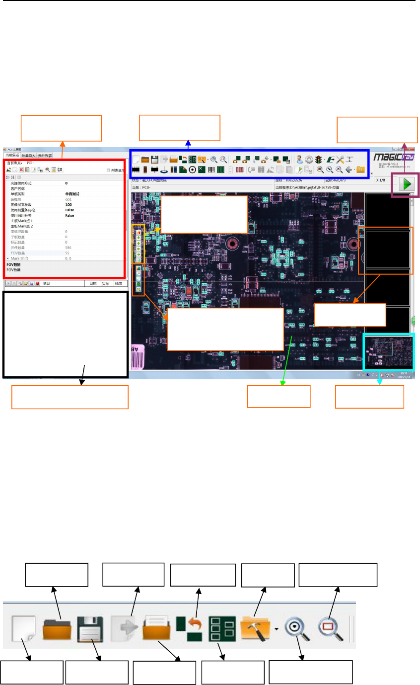 炉后 AOI 手册 8 第一章 主画面 第 1 节 主画面分布 第 2 节 快捷功能图标说 明 快捷功能图标 按功能分为 6 个模块 1.2. 1 “程序 操作” 模块 : 此模块的主要 作用是对程序进行 相关操作,具体如 下 颜 色 查 看 及 区 域 锁 定 处理功能模块 (左中) 批量检测按扭 检 测 窗 处 理 功 能模块(左上 ) 当前焦点信息 快捷功能模块 PCB 缩略图 测试结果载入 调试区 PCB 整图 FOV 缩略图 …