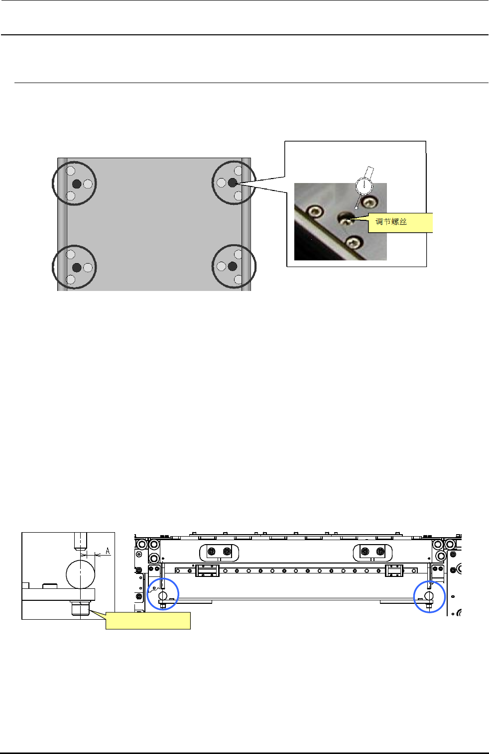 2)以 4 个测量点中最低的地方为基准,把调节螺丝向下降方向(螺丝旋紧的方向)旋转,调整到 4