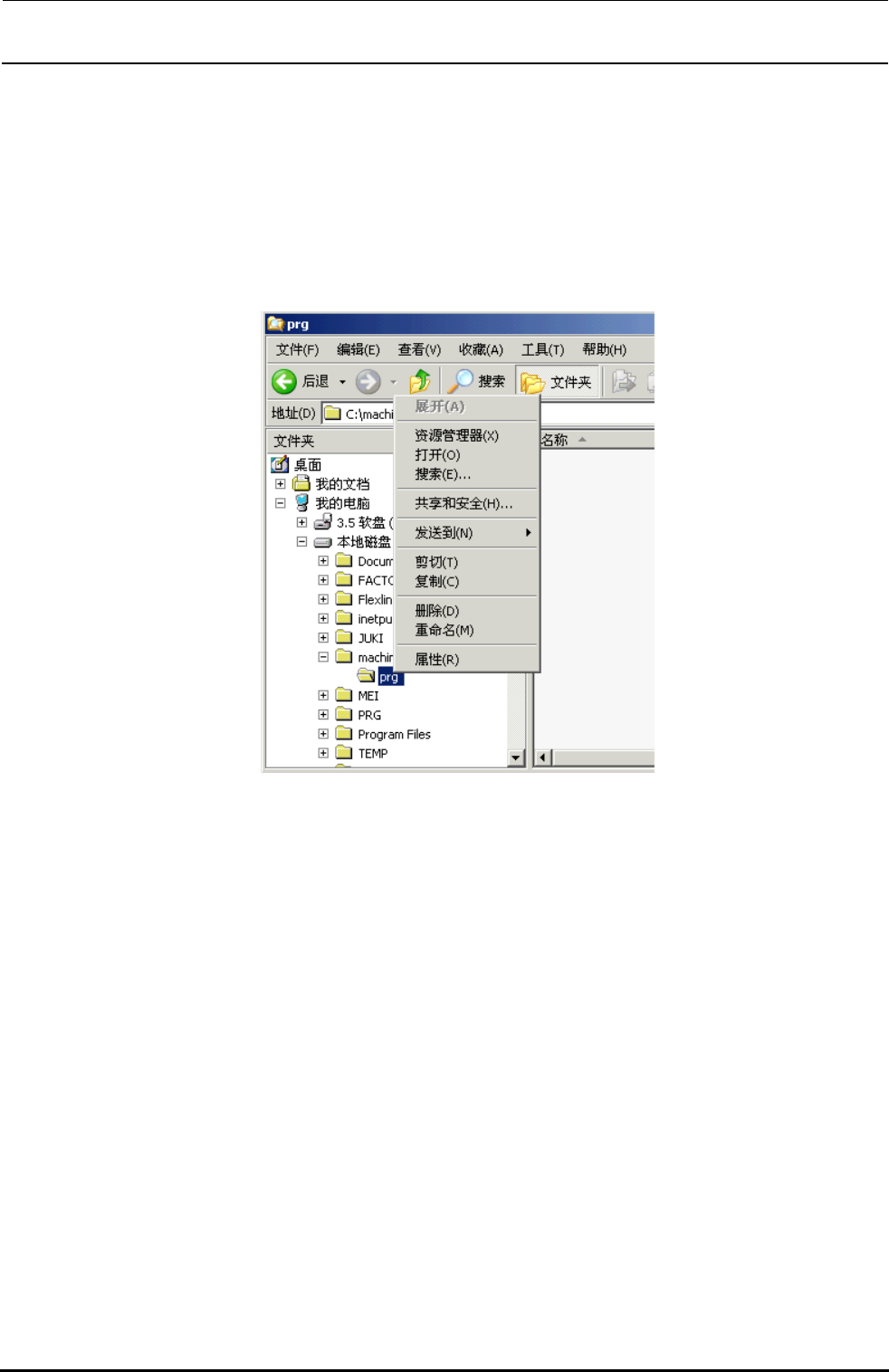 Rev 2.2 维修调整要领书 4 )于是在 C 驱动器下建立名为“ machine ”的文件夹。再用同样方法在 machine 文件夹下建立“ prg ” 文件夹。 5 )右键点击 prg 文件夹,请选择「共享和安全( H ) 」或「属性( R )」。 6 ) 于是显示 「 pr g 的属性」 对话框, 点击该对话框的① [ 共享 ] 选项卡, 选择② 「共享该文件夹」 , 并确认 「共享名」已成为“ prg ”。 • 如果共享名还不…