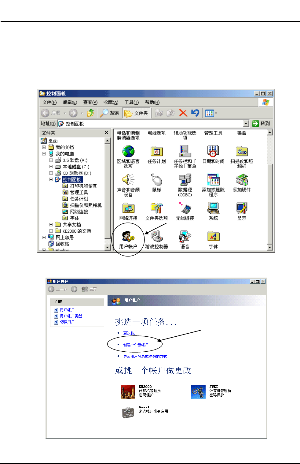 Rev 2.2 维修调整要领书 13 -6- 4-3 用户登记的设定 有 H LC 的 PC ( 电脑 ) 起动时进行输入,把 用户名 和 密码 登记到 CX -1 。 1) 请确认 HLC 侧 PC 起动时的用户名和密码 。 2) 从控制面板中选择“用户账户”图标。 3 )于是显示「用户账户」对话框,这里请选择 [ 创建一个新账户 ] 。 13-25