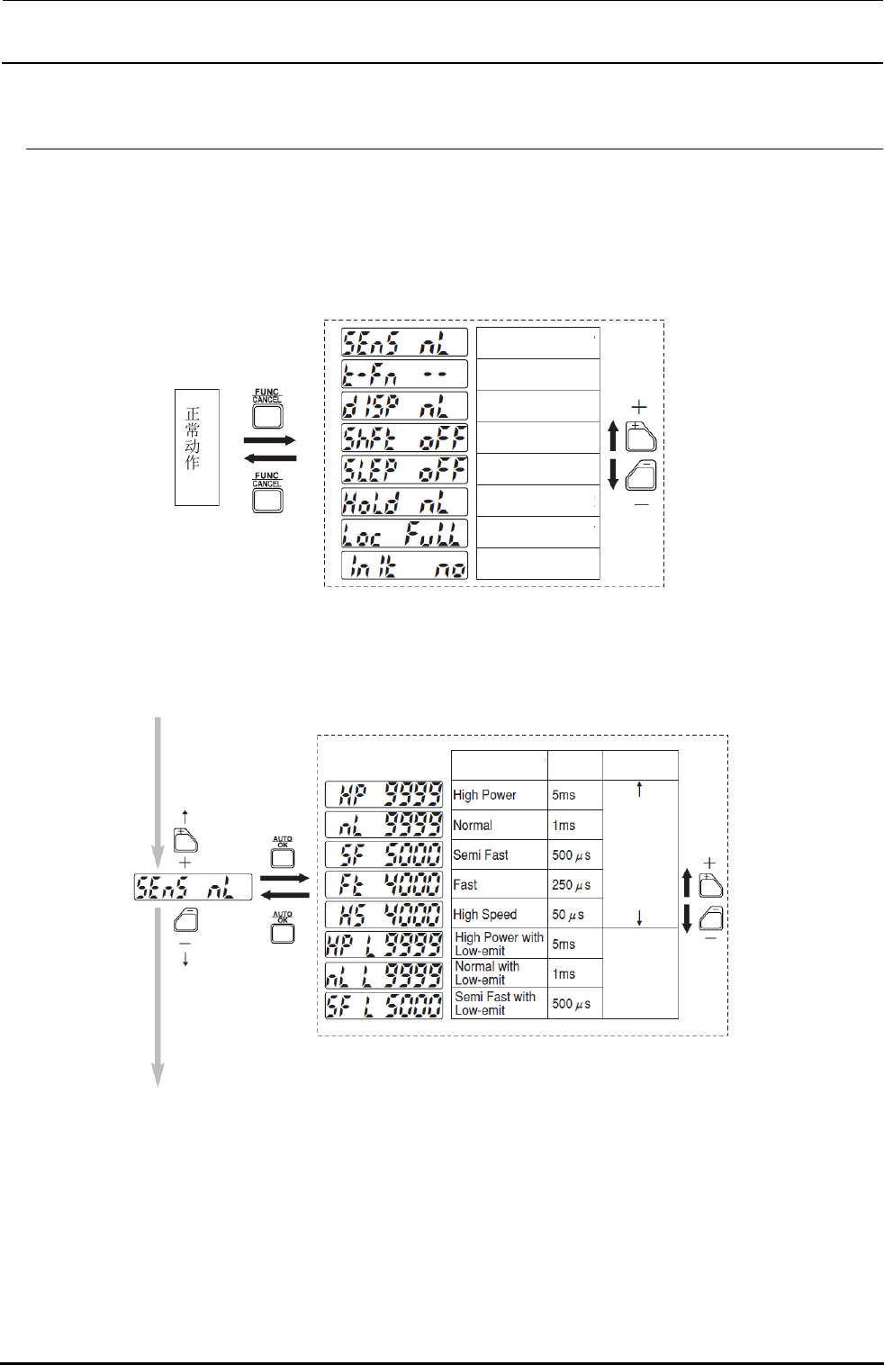 并且,各选择项目可用+或-按钮进行移动,用“AUTO/OK”按钮转移到选择项目的设定状态。