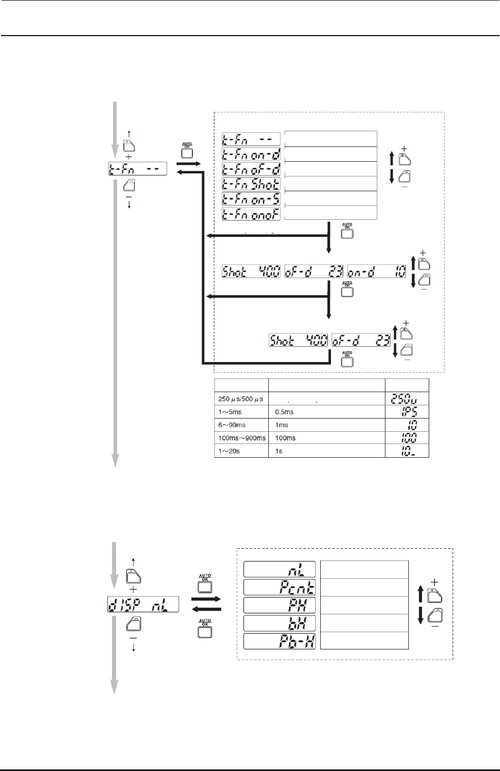 并且,各选择项目可用+或-按钮进行移动,用“AUTO/OK”按钮转移到选择项目的设定状态。