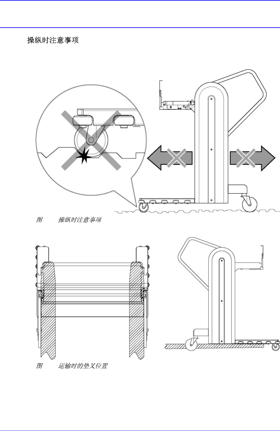 在柏油或粗糙的水泥地面等冲击大的地面上运输推车时请勿直接推动,请使用另外