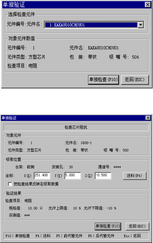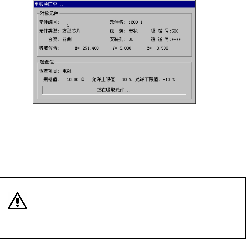第 1 部 基本编 第 2 章 生产 顶推一下供料器,送出元件(32mm的带状除外)。 ● 把检查结果反映在吸取数据(将示教结果反应到吸取数据中) 选择是否将使用HOD进行示教的结果反映在 吸取数据中。不选中时,坐标仅适用于此次 吸取。 ③ 验证结果 显示当前选中元件的检查项目、规格值、允许上限值、允许下限值。 元件检查后,在实测值中显示检查结果。 按下“单独检查”按钮执行单独检查,显示如下画面。 图 2-10-6-1-4 正在进行单独…