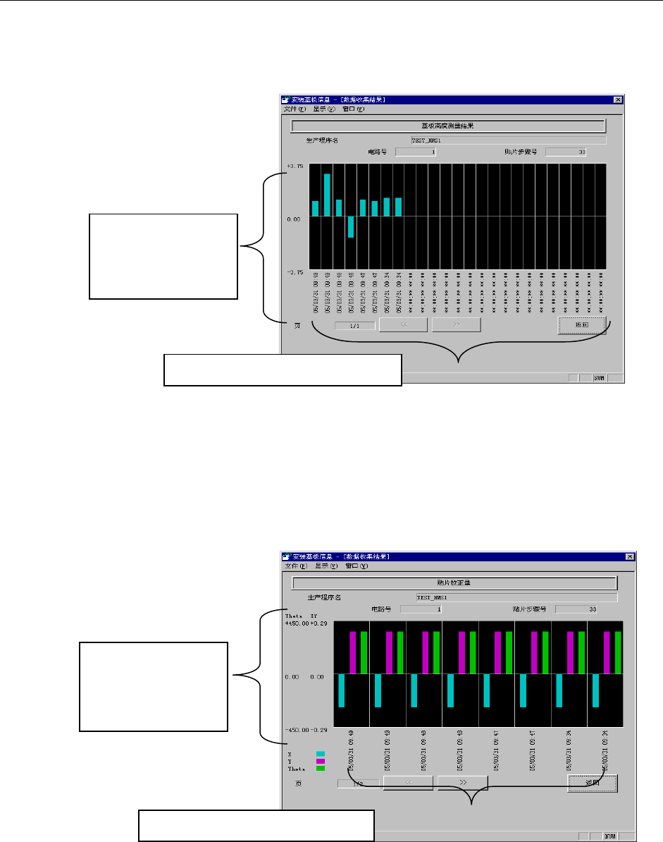 第 1 部 基本篇 第 2 章 生产 2-13-5 数据收集结果画面 ① 显示基板高度测量结果 在[数据收集] 画面的 [显示项目]里选择[基板高度测量结果]时 , 可显示所指定收集的生产程 序名的电路号、贴片步骤号的基板高度测量结果一览图表,图示如下。 保存日期。从左到右为从新到旧显示。 测量结果 (mm) 根据测量结果数值大 小,显示区会有变化 (最大值的 1.25 倍) 。 图 2-13-5 基板高度测量结果 收集画面 ② 显示贴…