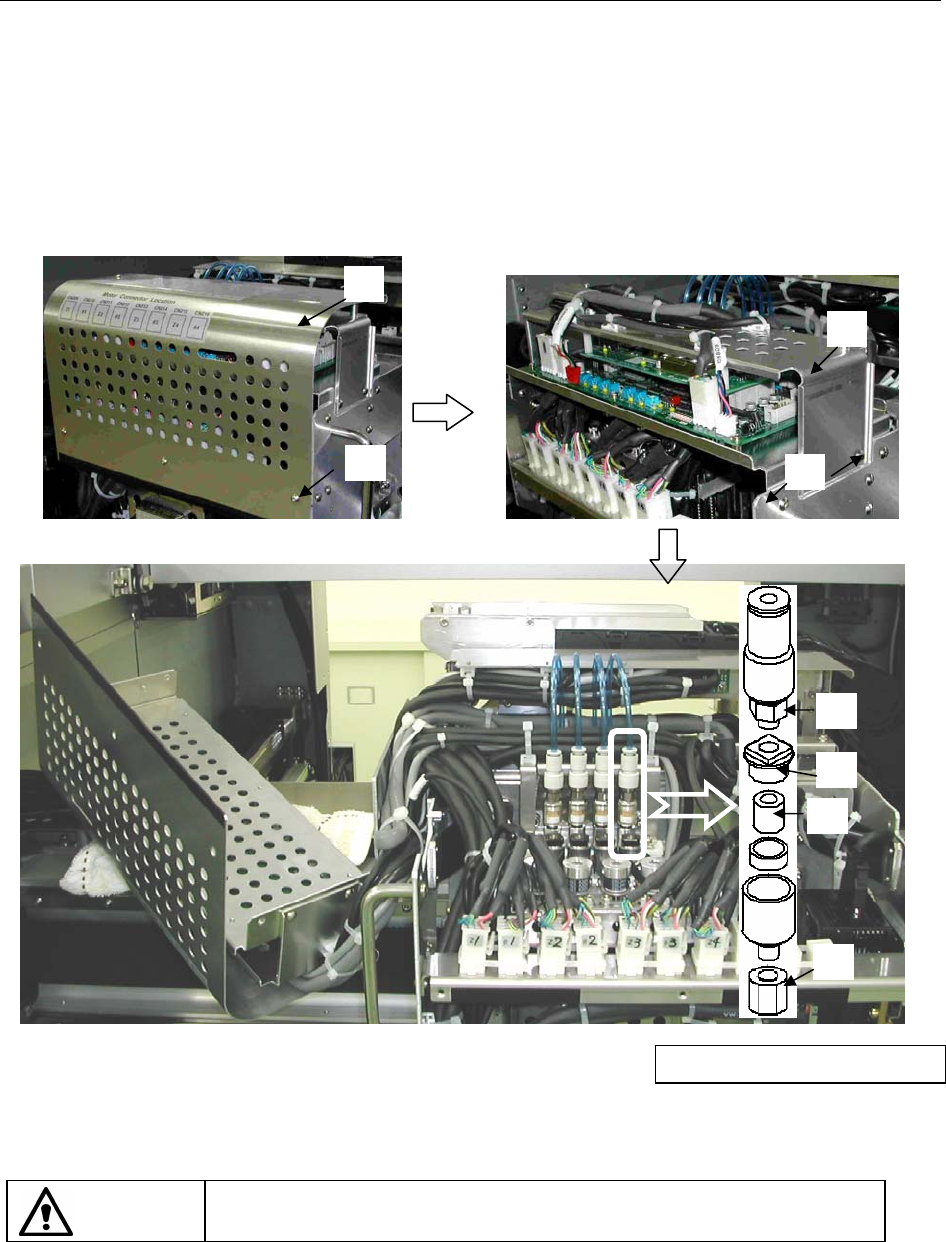 第1部 基本篇 第3章 维护 3-2-4 空气过滤器(MNLA贴片头、FMLA贴片头) 1. 松开“贴片头罩①”的 3 根“固定螺丝②” (西姆斯 CAP 螺栓) ,拆下“贴片头罩①” 。 2. 松开“贴片头基板底座③”的 4 个“固定螺丝④” ,向右侧拆下“贴片头基板底座③” 。 3. 如果 “过滤器⑤” 有脏污等, 用六角扳手把 「A」 和 「B」 卸下来, 再松开 “盖子⑥” ,更 换“ 过 滤器⑤” 。 4. 更换“过滤器⑤”后…