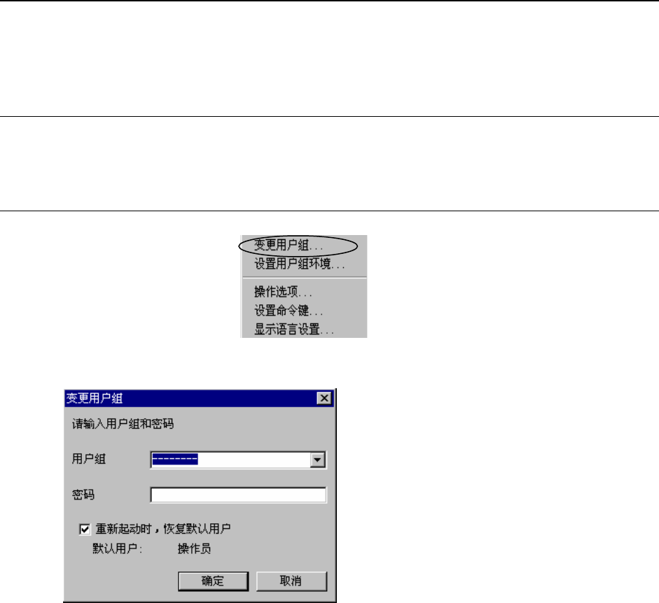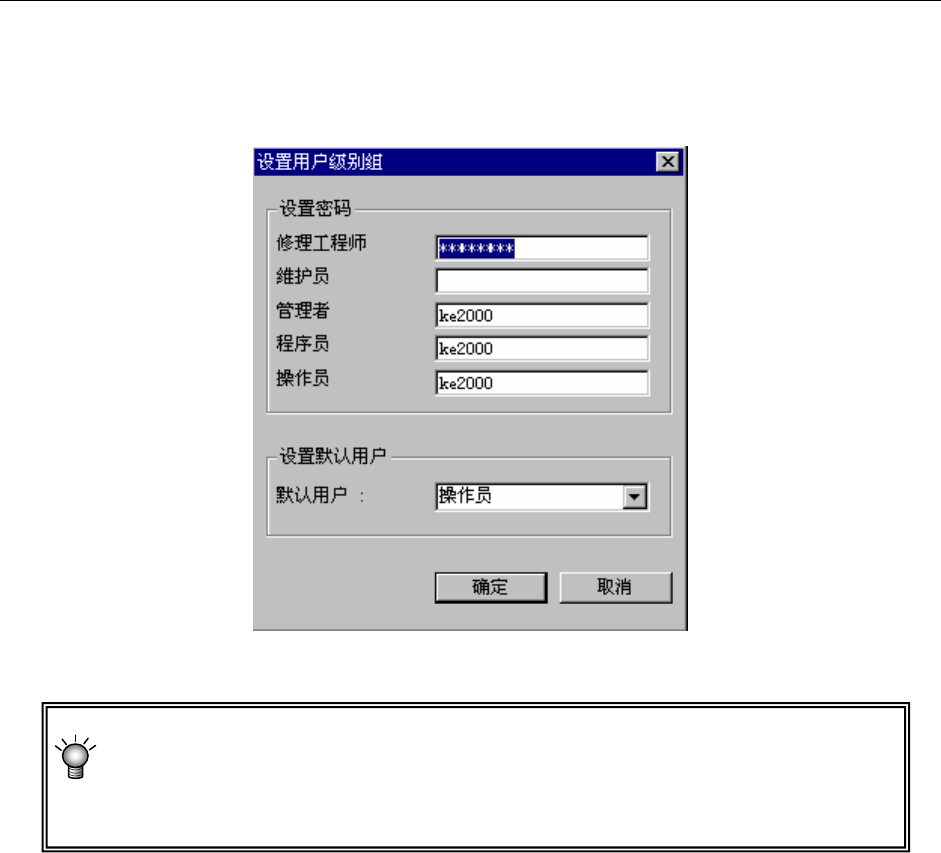 改变用户组时,要设置发生变动的用户密码。也可设置默认用户 (参见4-2-1-1 用户组变更、