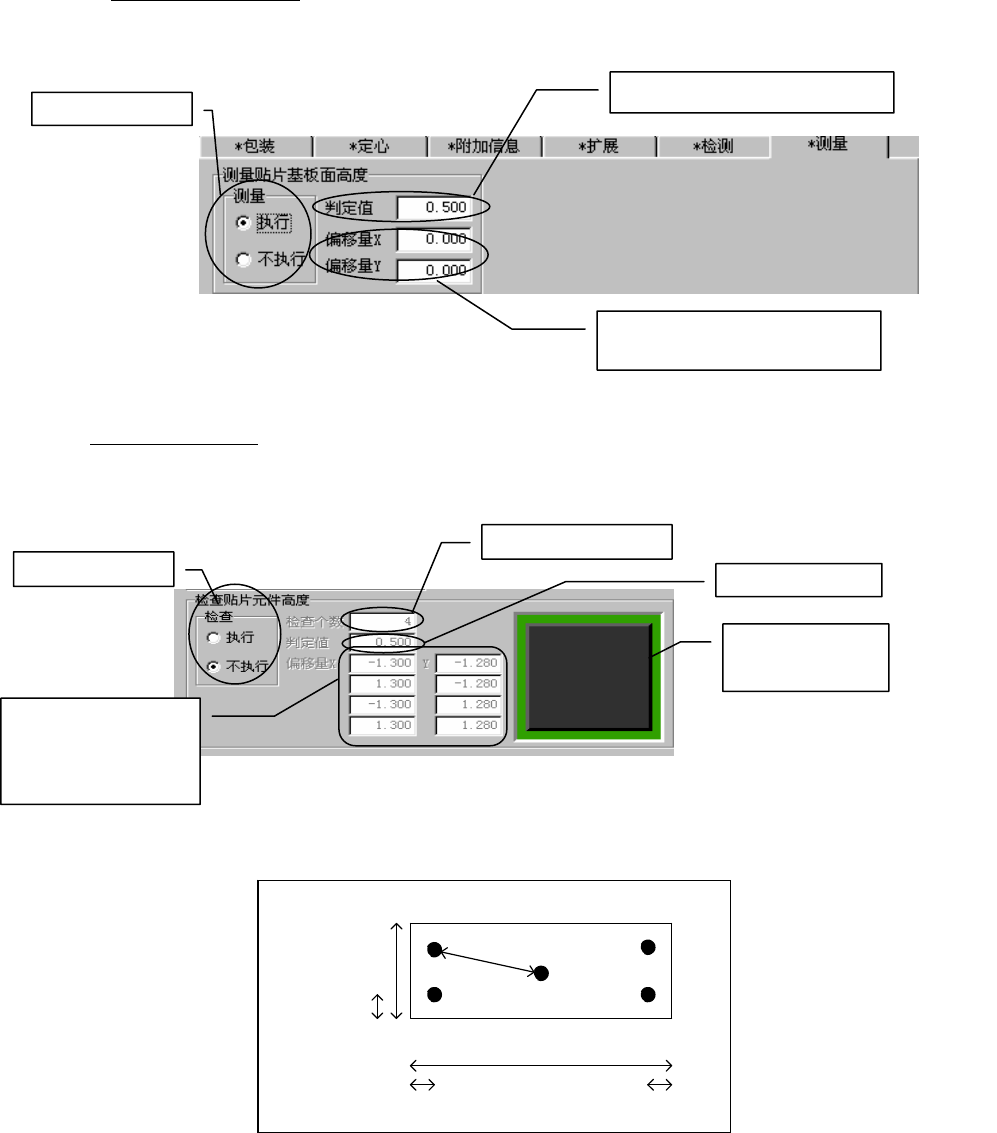 第1部 基本篇 第4章 生产程序制作 4-3-5-2-7 测量 在[测量]标签画面上选择[执行]/[不执行] “测量贴片基板面高度” , 要执行时, 应设置测量 或检查时的判定值、偏移量等。 测量贴片基板面高度 测量元件的贴片位置的基板面高度, 进行贴片 Z 坐标的校正。 测量位置为贴片点的中心(1 点)。 如果测量结果在 - 判定值 ~ + 判定值之间则判定为可以贴片。 检查贴片元件高度 贴片后,通过测量元件的四周的高度检查贴片元件是…