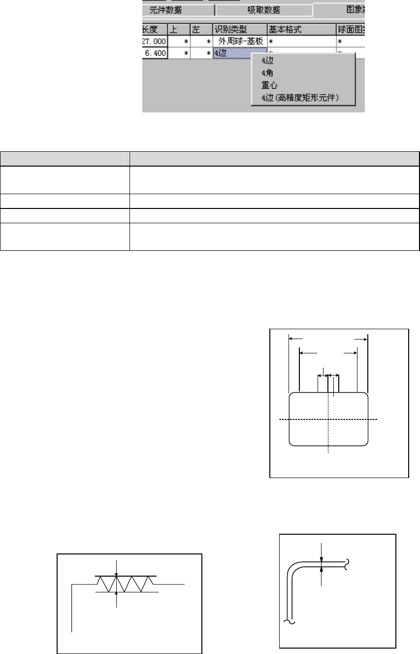 第1部 基本篇 第4章 生产程序制作 2) 当为 外形识别元件时 外形识别所适用的元件为接 近长方形或正方形的元件。 构成其外形的边必须在0.3mm 以上。 图 4-3-7-2-8-2 列表画面中的识别种类设置(外形识别元件) 表 4-3-7-2-8-2 识别种类 选择项目(当为外形识别元件时) 选择项目 识别方式 4边 根据四边形的 4 边来识别的方式。对无角的四边形来说是很有 效的方式。 4 角 根据四边形的 4 个角来识别的方式。…