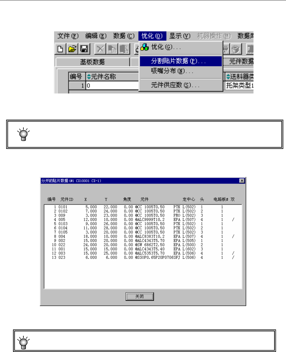 优化顺序时的标记“/”表示在 1 次吸取贴片的周期动作中被配对数据的区分。
