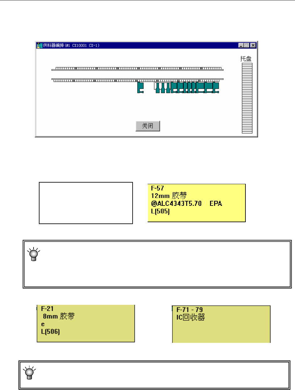 ① 将跟踪球光标移动到供料器编排窗口中的供料器图上时,显示该供料器的部分元件数据。