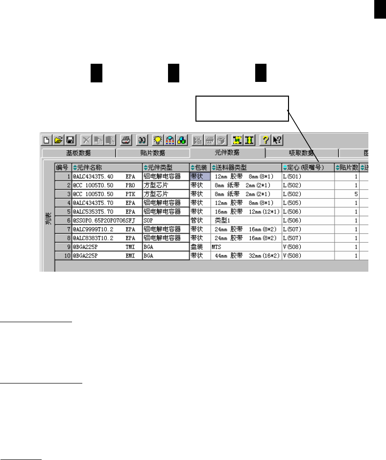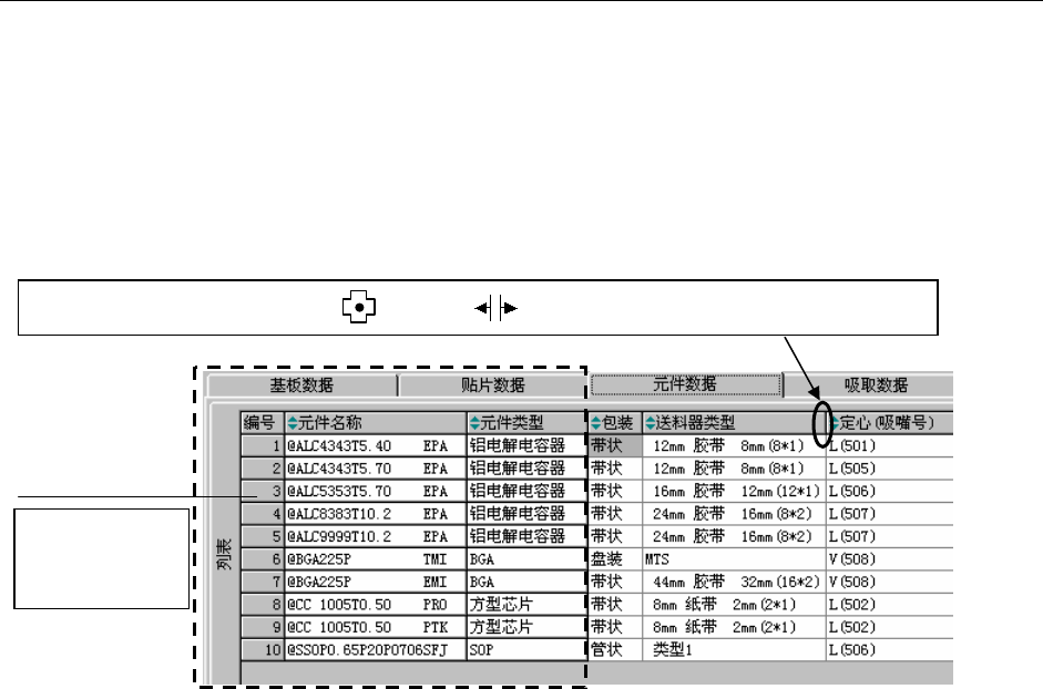 第1部 基本篇 第4章 生产程序制作 4-5-1-2 列表画面的功能 在编制程序画面的各种列表上,可以调整单元格的宽度,使用数据排序功能。 (1) 调整列表画面上的单元格宽度 在贴片数据列表等画面上,可以调整单元格的宽度。 当光标呈十字型时, 把光标移到列顶端行 (显示项目名称区) 单元格边线附近。 光标的左 右都变成箭头时,在保持该状态下拖拉光标,即可调整单元格的宽度。 光标在单元格附近从十字型 ( ) 变成 ( ) 拖拉光标,调整单…