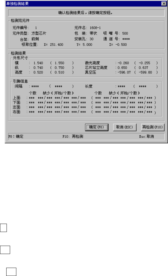 第1部 基本篇 第4章 生产程序制作 ③ 单独检测结果 单独检测结束后,显示如下的结果画面。 图 4-5-4-2-3-6 单独检测结果 (1) 检测完元件 显示元件内容及吸取位置。 (2) 检测结果 显示检测结果的值。( )内显示原来的元件数据值。 未进行检测的项目显示***。 (3) 确定 (F8键 ) 使检测结果生效, 将结果值储存到元件数据中。 然后返回原来的单独检测条件的设定画面。 (4) 取消( ESC 键) 使检测结果无效,…