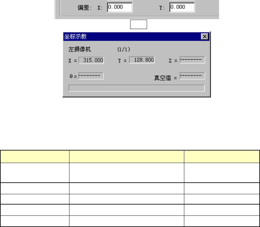 第1部 基本篇 第4章 生产程序制作 ④ 更改吸取偏差 检查时使用的元件吸取位置与实际位置不同时,可以使用 HOD 对吸取坐标进行示教。 也可不采用示教方法,而用手动输入更改坐标。 步骤 1) 把光标移动到 X 或 Y 坐标上。 步骤 2) 按下 HOD 按钮,示教坐标,按 ENTER 键定位。 图 4-5-4-3-6-3 示教中对话框 ⑤ 检查种类 检查项目的功能概要列表如下。 表 4-5-4-3-6-1 检查项目功能概要 检查项目 …