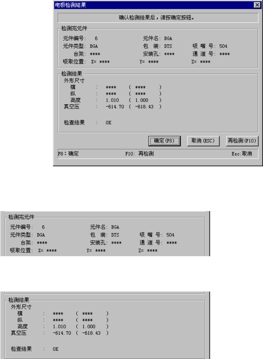 第1部 基本篇 第4章 生产程序制作 (3) 电极检测结果 元件示教完毕后,显示下列对话框。 图 4-5-4-6-11 图像元件示教检测结果对话框 1) 检测完元件 显示元件内容以及吸取位置。 2) 检测结果 显示检测的结果值 。 ( )内是原来的元件数据值。 没有检测的项目显示为 *** 。 4-253