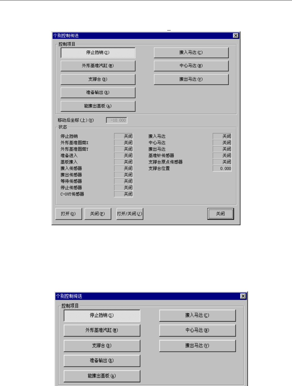 第 2 部 功能详细编 第 9 章 手动控制 9-4-2 传送 9-4-2-1 个别控制传送 从菜单栏中选择“控制”/“传送”/“个别控制(I )”,则显示如下的传送类个别控制画面。 图 9-4-2-1-1 传送类个别控制 (1) 控制项目 利用按钮来选择控制项目。 图 9-4-2-1 -1(a) 9-19