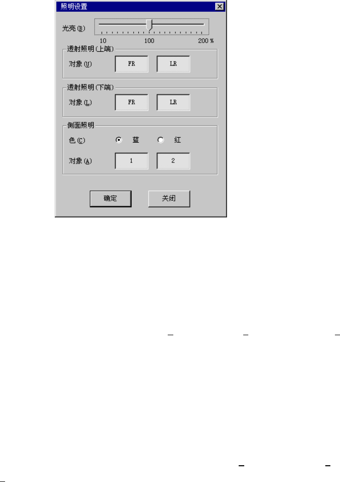 第 2 部 功能详细编 第 9 章 手动控制 (3) 控制按钮 利用控制按钮来执行控制项目。 控制按钮的显示因控制项目而异。 ① 透射照明、侧面照明、下方照明、同轴落射照明、全照明 选择控制项目后,再选择“ON(1)”按钮、“OFF(2)”按钮、 “ON/OFF(3)”按钮或按下“F3” 键、“F4”键、“F5”键来进行控制。 选择控制项目后,再选择“设定(4)”按钮或按下“F6”键,显示照明设定画面。 在照明设定画面中可选择照明与光量…