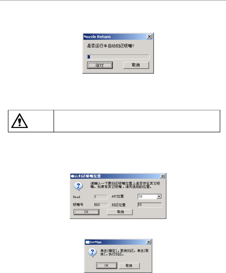 按[OK]按钮后,摄像机会移动到吸嘴归还的 ATC 位置上,并显示如下对话框要求确认。