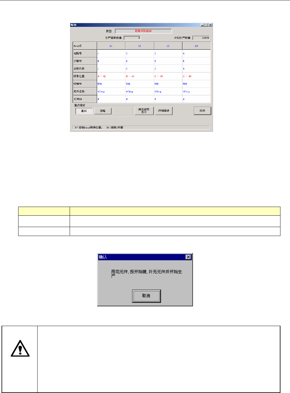 ●重试:将所有元件的剩余数补满后,从该吸取贴片循环起重新开始生产。