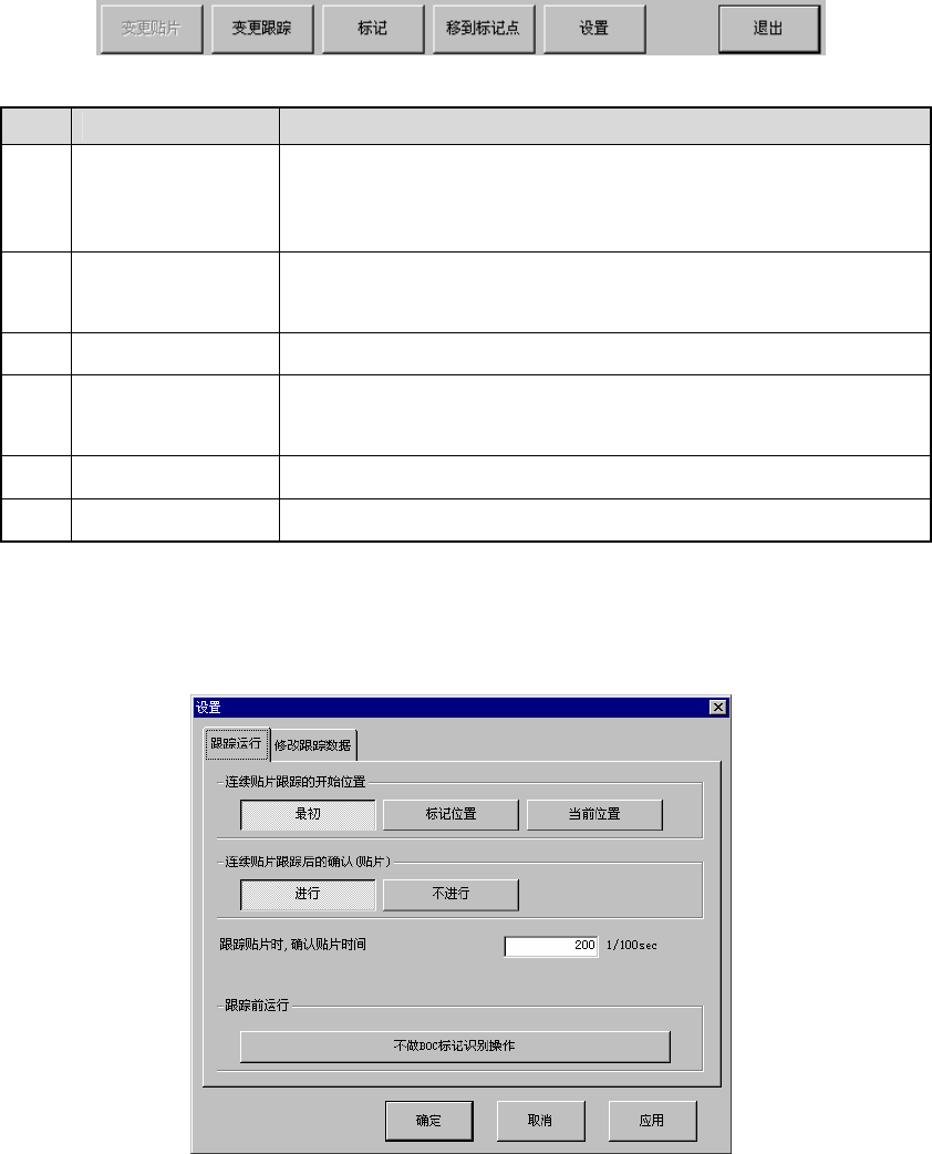 第 1 部 基本篇 第 2 章 生产 4) 按钮 按照选择的按钮内容进行动作。 图 2 -12-2-2-4 按钮 No. 项目 内容□ 1 变更贴片 对于贴片点一览表中所 选中行的贴片项目,如果是“执行(贴 片) ” , 则变更为 “不执行 (不贴片) ” , 如果是 “不执行” ,则 变 更为“执行” 。但不能进行贴片的点将保持“不执行” 。 仅当有继续生产文件时方可变更。 2 变更跟踪 对于贴片点一览表中所 选中行的跟踪项目,如果是…