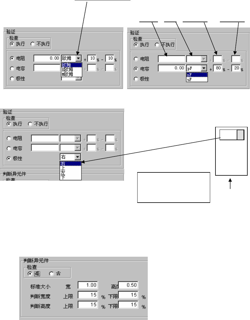 指定是否检查电阻值、电容器容量与极性,及其判定值。可对生产前与元件用完后的最